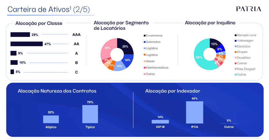 E há um terceiro problema, talvez o mais silencioso e perigoso: os imóveis estão envelhecendo. Dos 28 galpões da carteira, só 29% são classe AAA, modernos, com pé direito alto, iluminação natural, docas novas — o que o Mercado Livre, a Amazon e as grandes empresas exigem hoje. Quinze por cento já são classe B ou C: pé direito baixo, pouca iluminação, piso que não aguenta carga pesada. Galpões da década passada. E, como mostram os números, os AAA estão 100% locados. Os B e C são exatamente os que estão devolvendo as chaves.