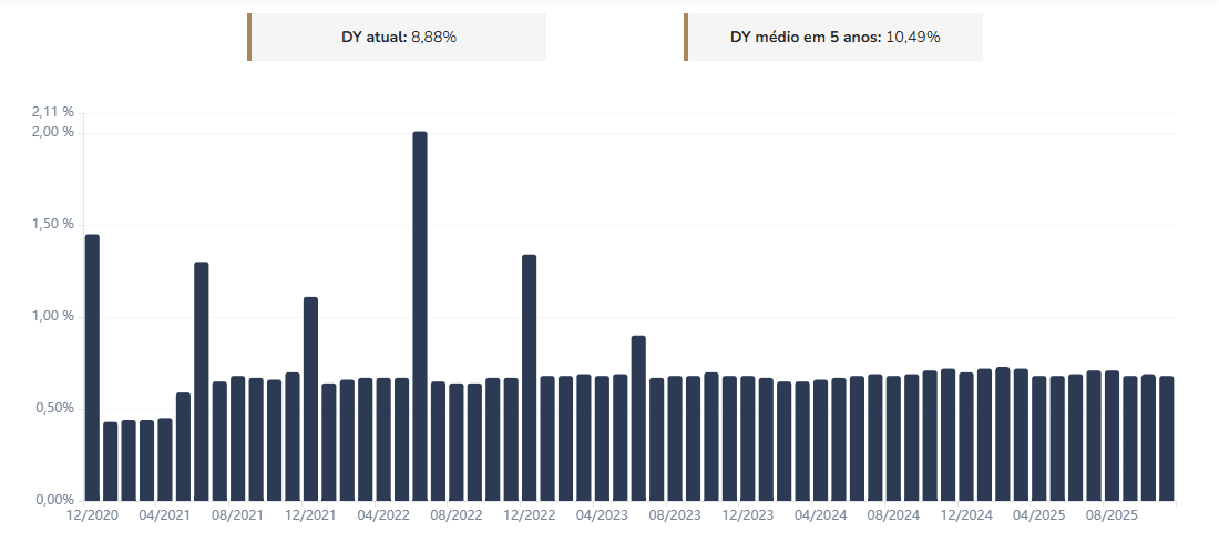 Em 2021, o fundo distribuía R$ 1,10 por cota. Em 2025, quatro anos depois, continuava distribuindo exatamente R$ 1,10. Os contratos são reajustados todo ano pelo IPCA, a vacância caí… e mesmo assim o rendimento não cresce. É o primeiro sinal de que algo pode estar ocorrendo nos bastidores.