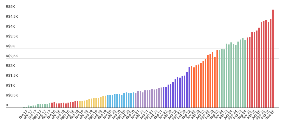 - Renda Passiva Média Recorde: Atingimos uma média próxima de R$ 5 mil — um marco, e um valor muito maior que do esperávamos para 2025, em grande parte pelo adiantamento do pagamento de dividendos devido a nova tributação de 10% sobre o que exceder R$ 600 mil anuais.